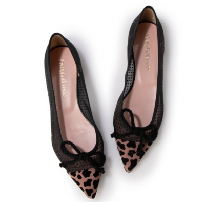 グリッターを散りばめたメッシュ素材は、繊細な輝きと程よい透け感が魅力。トゥにはジラフ柄のスエードを合わせて、Pretty Ballerinasらしい遊び心のあるスタイルに。